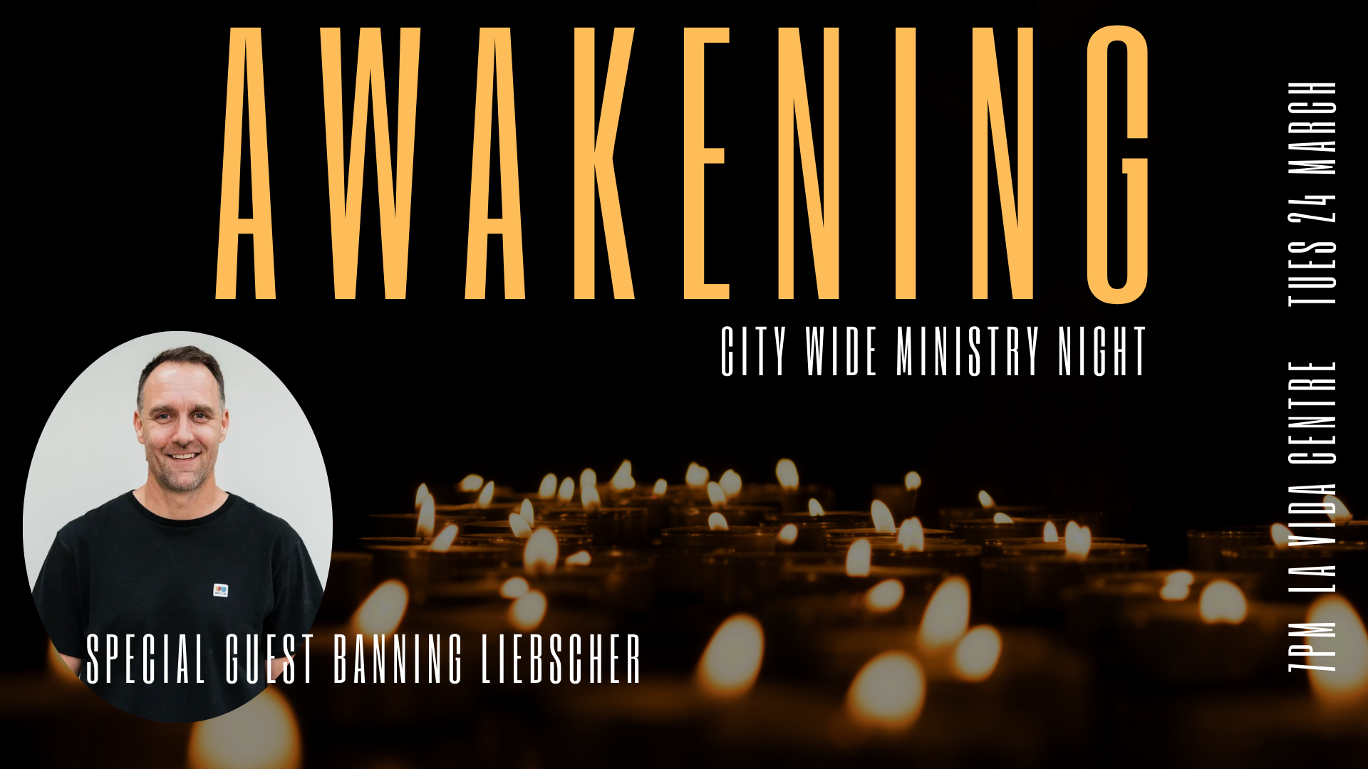 Awakening Worship Night Tuesday, 24 March 2026 7:00 pm 9:00 pm 19:00 21:00 Christchurch, Canterbury, 8041 New Zealand (map) Google Calendar ICS 7–9pmCity-Wide Worship NightJoin us at La Vida for a city-wide worship night. We have the privilege of hearing from Banning Liebscher from Jesus Culture Church.